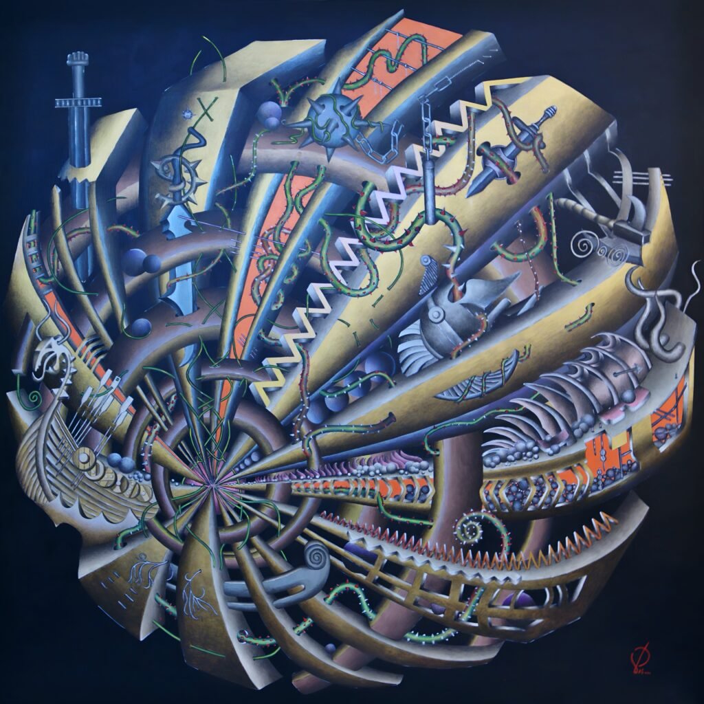 At the center of the composition, the hourglass marks the only real point in time: now. Evolution, consciousness, and life do not unfold in future expectations or in memory, but in the present moment as it slips away while we inhabit it. Time passes, the body ages, death is inevitable, and precisely for that reason the present becomes an act of awareness and responsibility.
